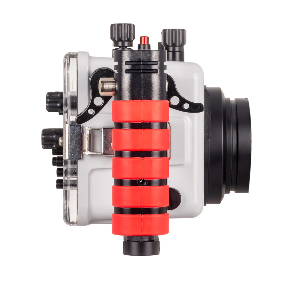 Built-in Ikelite TTL circuitry connects via electrical bulkhead to compatible DS strobes, delivering fast and accurate Through-The-Lens flash exposure. The housing includes dual handles, trigger extensions, and a vacuum system for pre-dive leak checks, all housed in a lightweight yet durable ABS-PC construction.